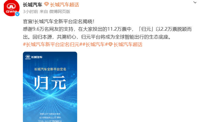 长城汽车新平台定名“归元”