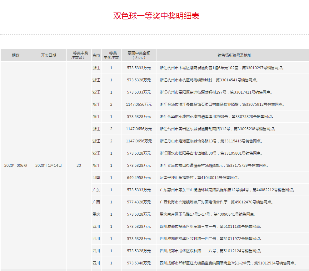 双色球2020年第006期一等奖中奖明细