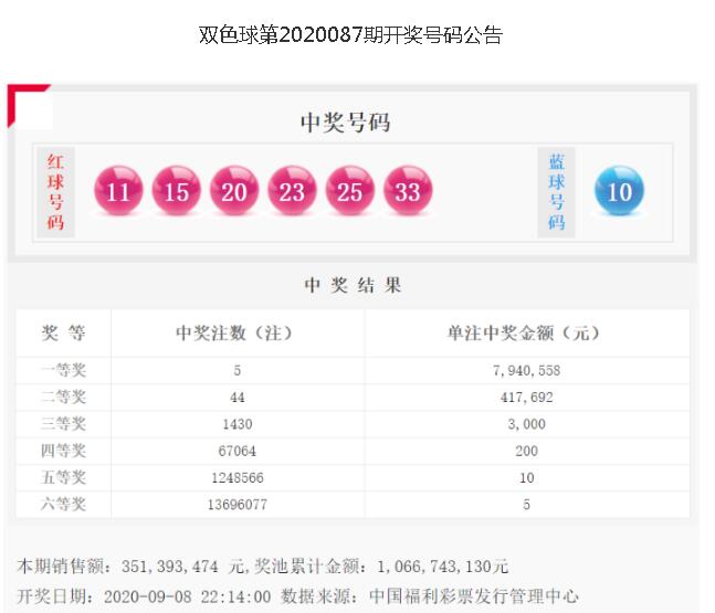 9月8日晚,中国福利彩票双色球游戏进行第2020087期开奖。当期双色球红球号码为11、15、20、23、25、33,蓝球号码为10。