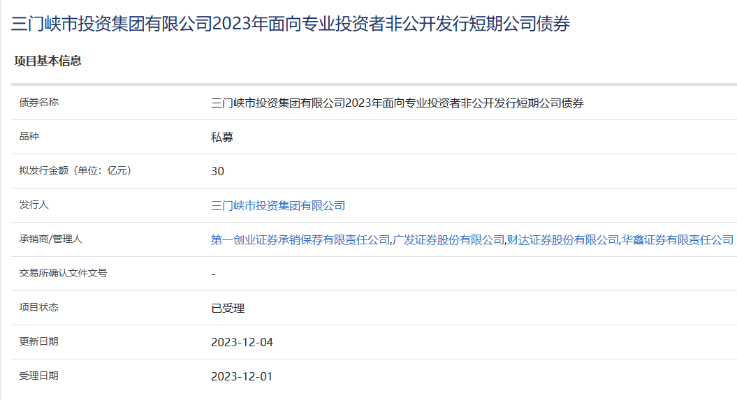 【大河财立方消息】 12月4日,据上交所债券项目信息平台,三门峡市投资集团拟发行30亿元公司债,获上交所受理。