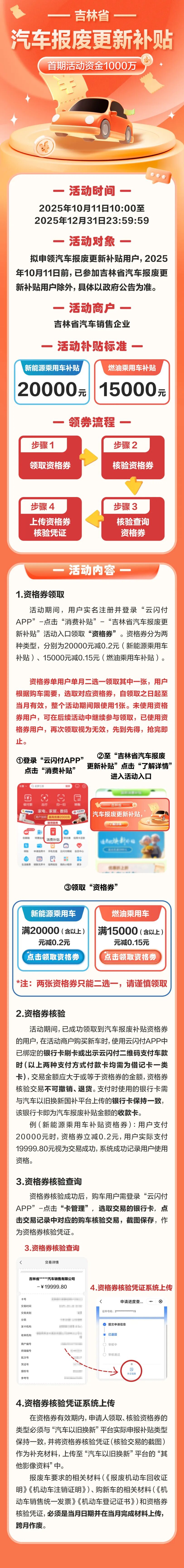 【大河财立方消息】 10月11日,据“吉林发布”,根据国家保障消费品以旧换新政策要求,吉林省即日起调整汽车报废更新补贴政策。