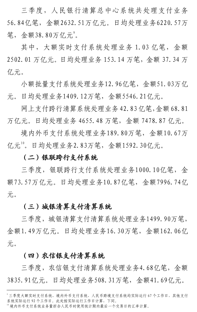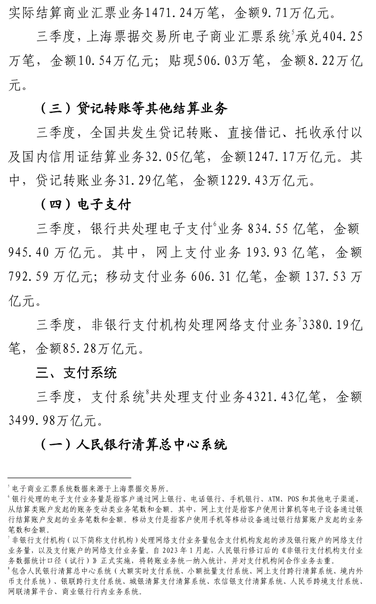 三季度,全国银行共办理非现金支付业务1685.08亿笔,金额1503.36万亿元。支付系统共处理支付业务4321.43亿笔,金额3499.98万亿元。