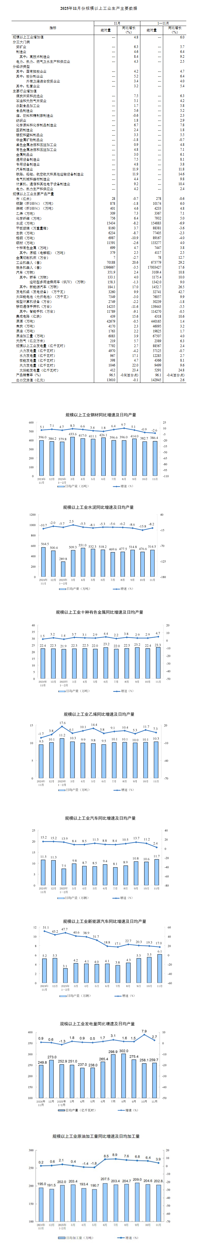 分产品看,11月份,规模以上工业623种产品中有310种产品产量同比增长。其中,钢材11591万吨,同比下降2.6%;水泥15434万吨,下降8.2%;十种有色金属699万吨,增长4.7%;乙烯309万吨,增长7.3%;汽车351.9万辆,增长2.4%,其中新能源汽车184.1万辆,增长17.0%;发电量7792亿千瓦时,增长2.7%;原油加工量6083万吨,增长3.9%。