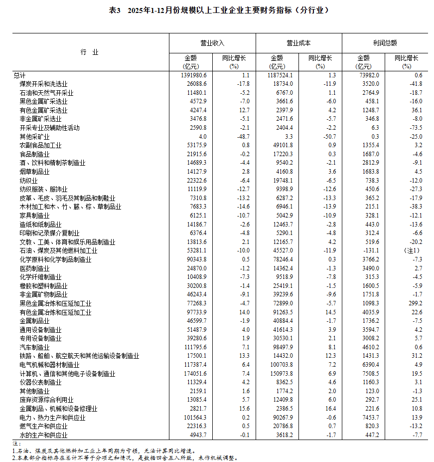 【大河财立方消息】 2025年,全国规模以上工业企业实现利润总额73982.0亿元,比上年增长0.6%(按可比口径计算)。