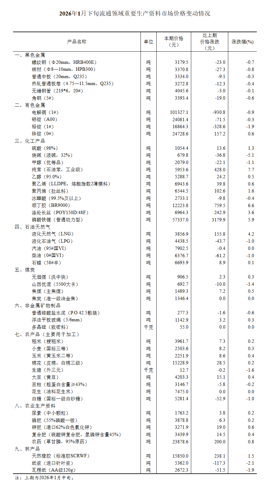 【大河财立方消息】 2月4日,国家统计局发布2026年1月下旬流通领域重要生产资料市场价格变动情况.