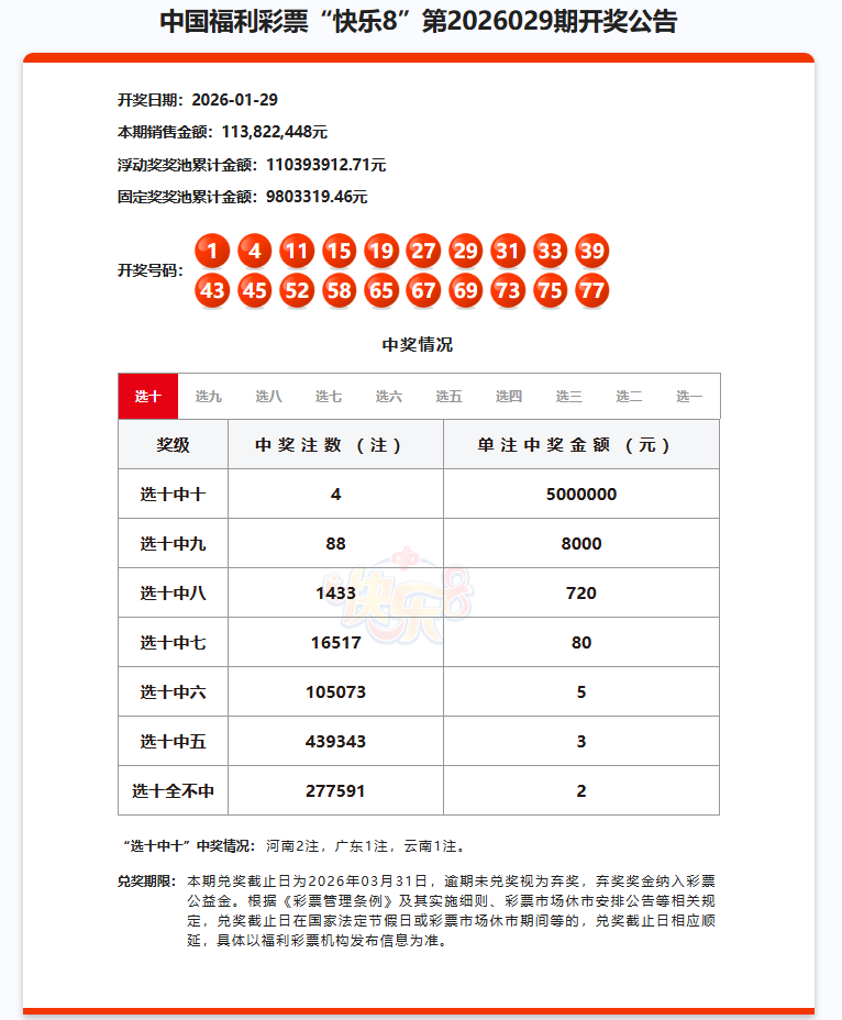 1月29日晚,福彩快乐8第2026029期开出4注“选十中十”大奖,单注奖金500万元,其中2注花落河南。