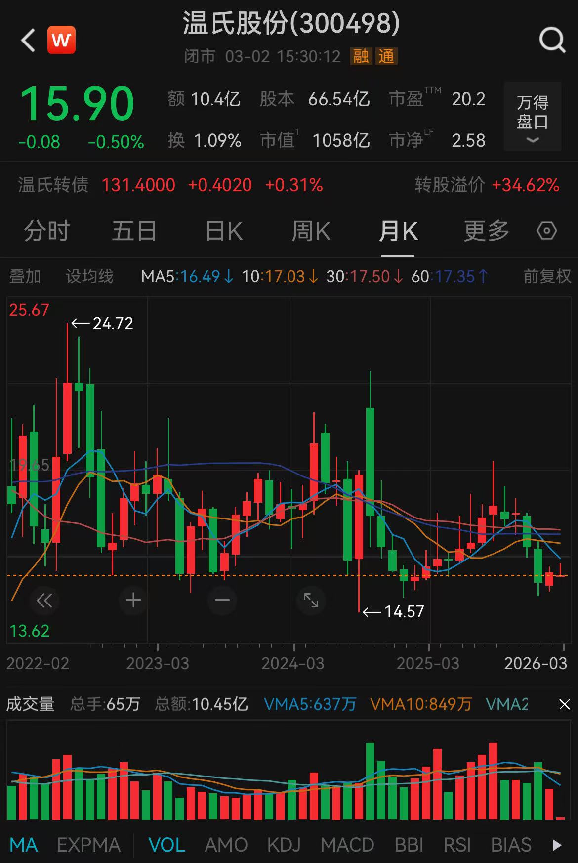 截至3月2日收盘,温氏股份报15.9元/股,跌幅0.50%。