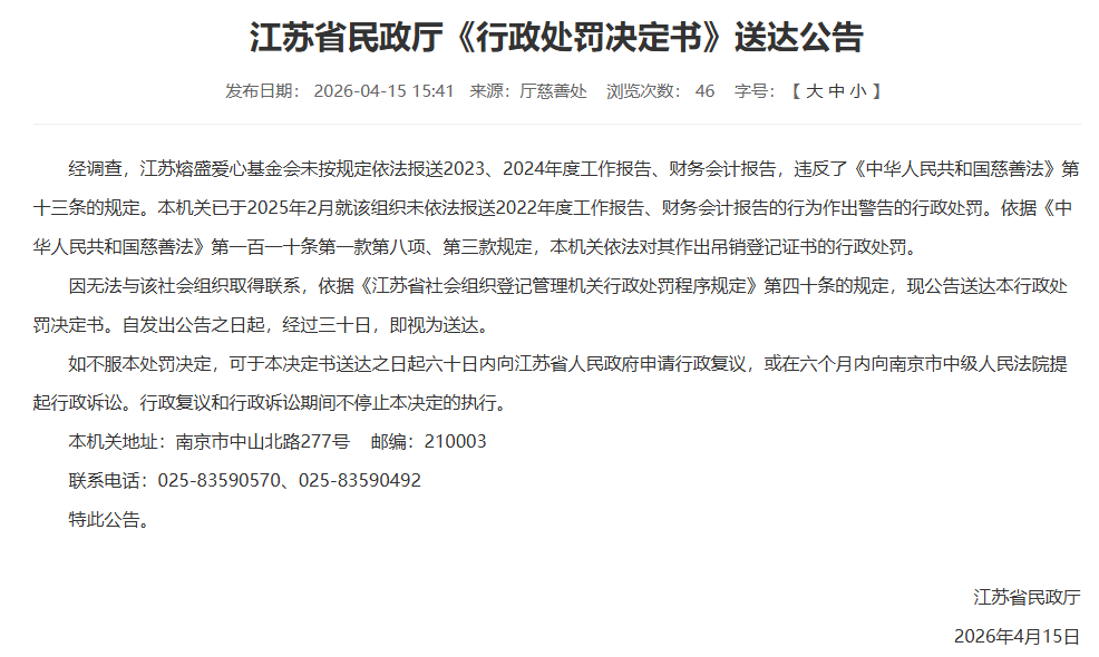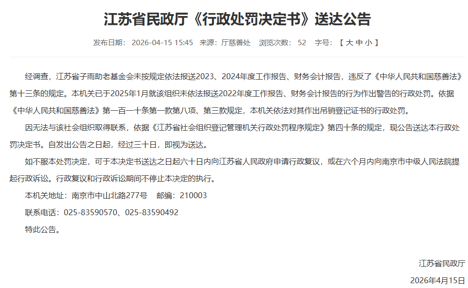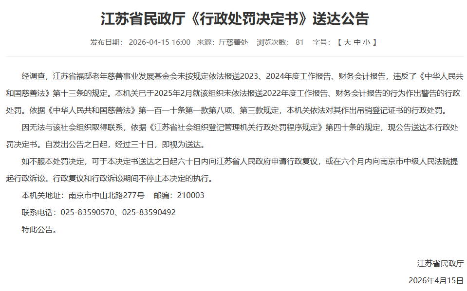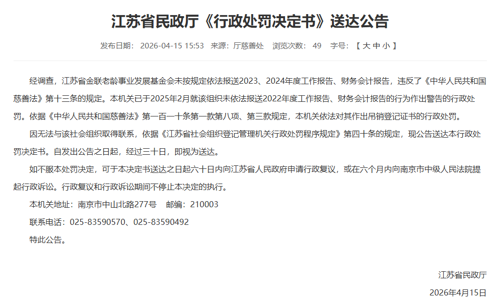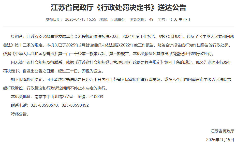 【大河财立方消息】4月16日消息,江苏省民政厅日前披露5份《行政处罚决定书》送达公告。
