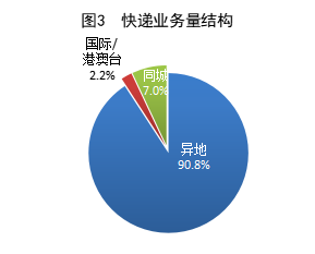 1—3月,同城、异地、国际/港澳台快递业务量分别占全部快递业务量的7.0%、90.8%和2.2%。与去年同期相比,同城快递业务量的比重下降1.0个百分点,异地快递业务量的比重上升1.1个百分点,国际/港澳台业务量的比重下降0.1个百分点。