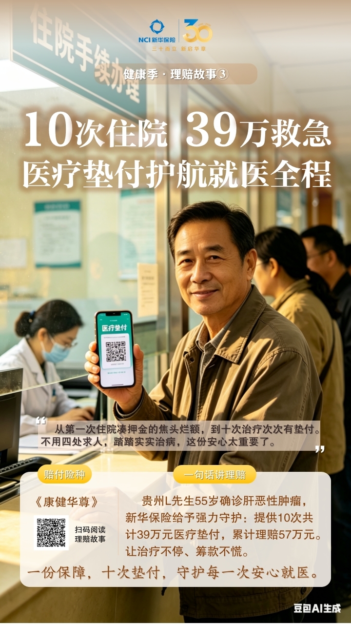 从2025年7月到现在,L先生先后住院10次,药费、检查费、治疗费像流水一样花出去,好在新华保险一笔笔垫付款及时支持、一笔笔理赔款快速到账,累计已为L先生报销医疗费用超过57万元(其中39万元提供了垫付服务)。