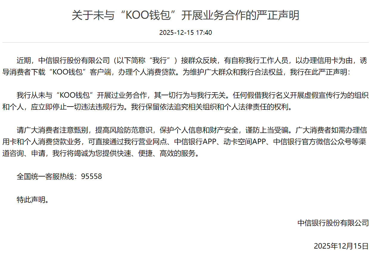 中信银行声明!从未与“KOO钱包”开展过业务合作...