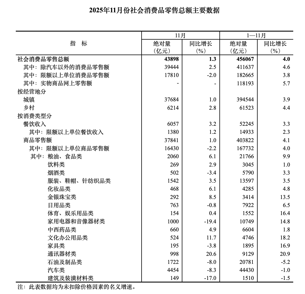按消费类型分,11月份,商品零售额37841亿元,同比增长1.0%;餐饮收入6057亿元,增长3.2%。1—11月份,商品零售额403822亿元,增长4.1%;餐饮收入52245亿元,增长3.3%。