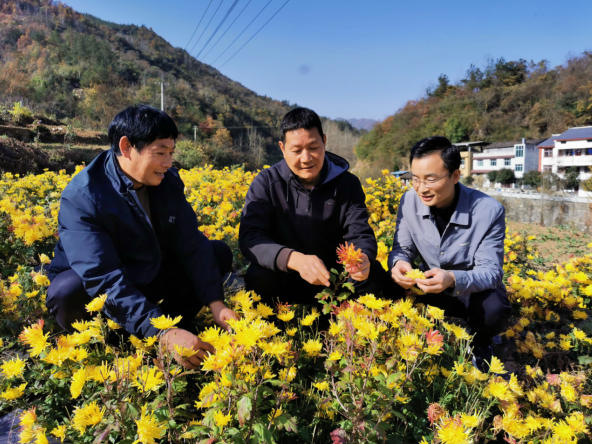 图:中国人寿派驻驻村干部查看帮扶产业金丝皇菊种植情况